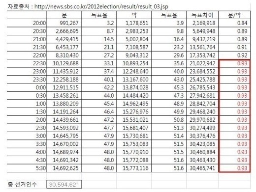 어떤분이 SBS자료를 엑셀로 분석해보셨네요? (저도 SBS사이트에서 일일이 득표누계숫자 확인해봤음)