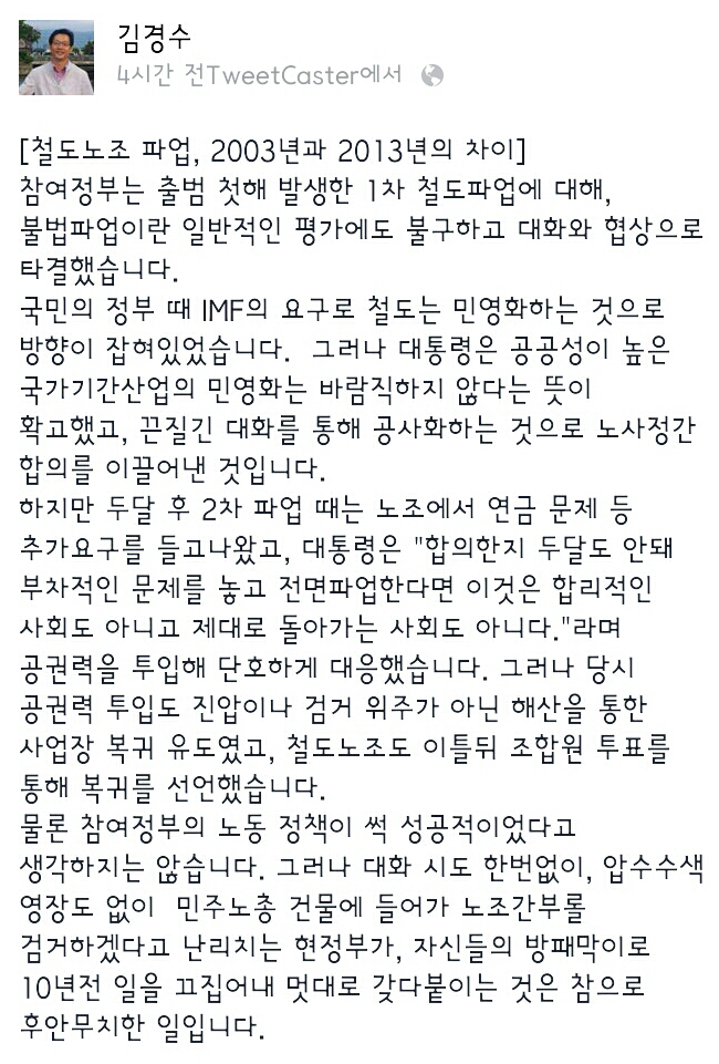철도노조 파업관련 닥과 똥누리의 헛소리에 김경수님 트윗글 (글쓰기 제한 때문에 이글에 붙임)