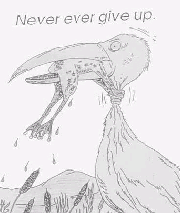 다가 오는 개구리들을 보기 좋게 입을 다시며 잡아 먹는 황새 임금님! 훌륭한 임금님을 모시게 되었다고 기뻐하던 개구리 연못에는, 얼마 후 한 마리의 개구리도 보이지 않게 되었다 합니다.