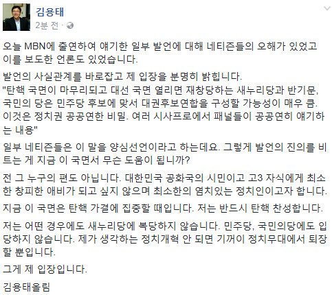 저는 어떤 경우에도 새누리당에 복당하지 않습니다. 민주당, 국민의당에도 입당하지 않습니다. 제가 생각하는 정치개혁 안 되면 기꺼이 정치무대에서 퇴장할 뿐입니다.