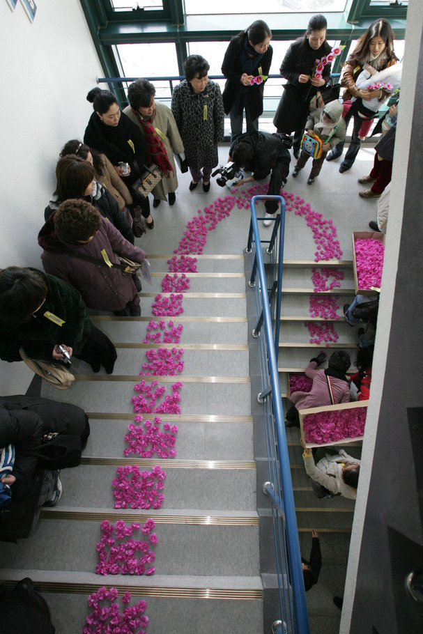 2005년 12월 서울대학교 수의대학에서 황우석 박사의 지지자들이 진달래 꽃길을 만들어 황 교수의 지지를 표명하고 있는 모습.9. ㄴㄴㄴ