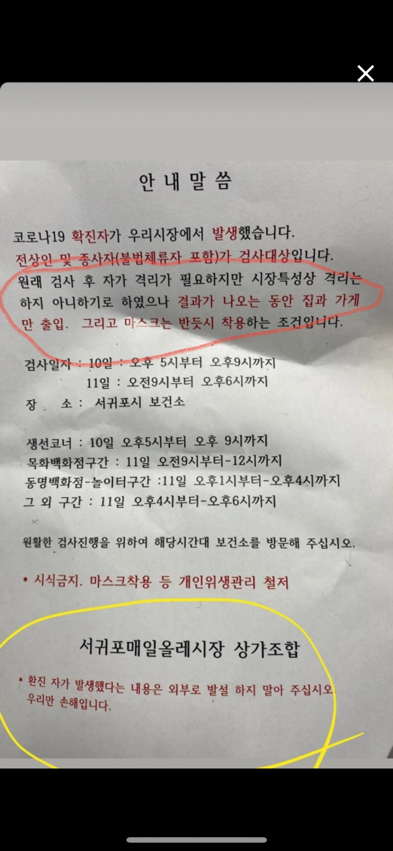 확진자 발생한 서귀포 모 시장의 안내문