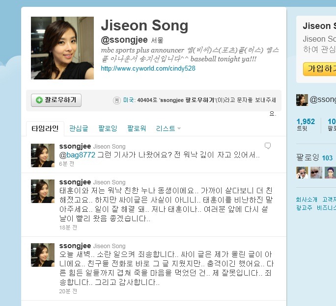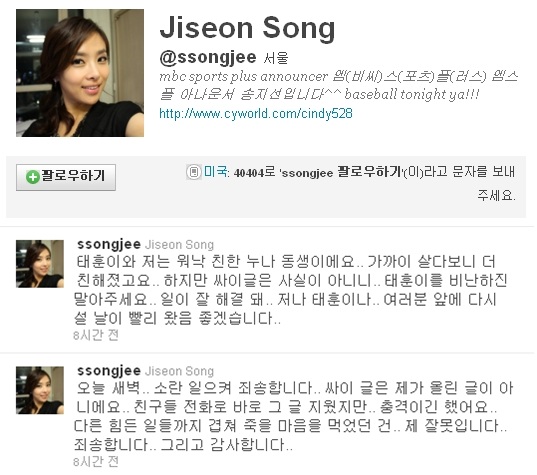 '11.5.9 5:43 PM (125.177.xxx.83)송지선 아나운서가 임태훈에 대해서 사실이 아니라고 트위터에서 부인한 글 올린 거야 뒤늦게 사태 수습하려는 목적으로 올린 걸테고 임태훈은 김경문 감독한테 끌려가서 대부분 사실이라고 본인 입으로 얘기했다는 것이 기사까지 나왔는데 무슨 헛소리....