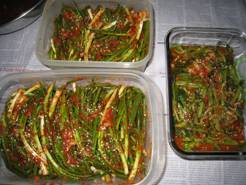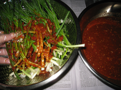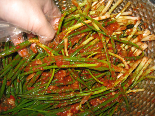 다 버무려 졌으면, 양념 고루 버무려진 쪽파를 잡고..