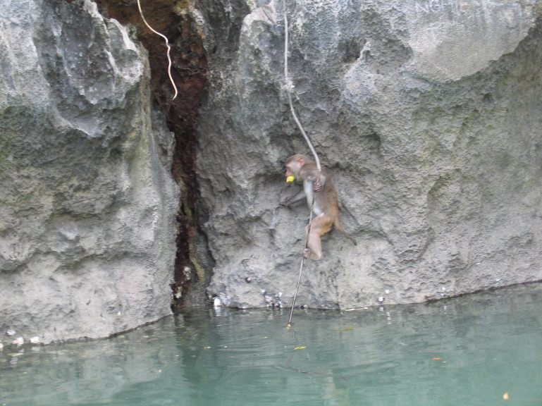 우리가 바나나를 던지면 나무위에서 받아먹는데 간혹 못잡고 강가에 떨어진건 내려와서 집어가는 센스~
