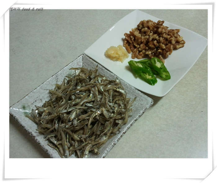 멸치 80g, 호두2줌, 청양고추1개, 마늘2톨 (재료가 늠 간단하지요??)