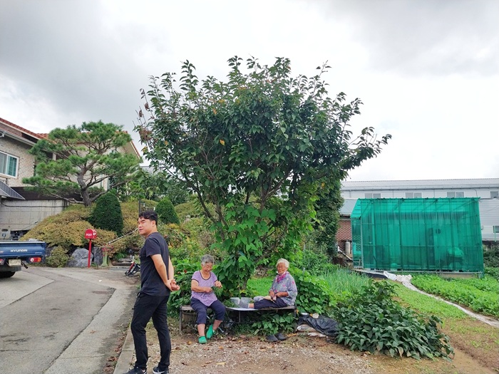 이모는 나무 아래서 이웃할머님이랑 부추를 다듬고 계셨답니다.