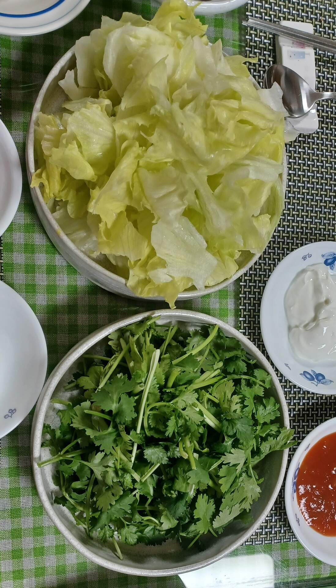 양상추, 고수, 살사소스, 그릭요거트에 알룰로스 섞어서 놓고, 이날 과카몰리는 없어요