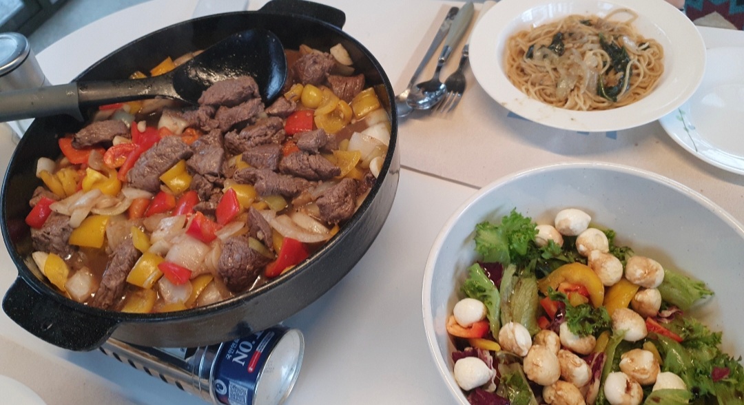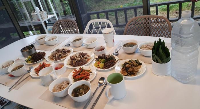 반찬 몇 가지 가져 갔는데 굳이 둘이 하겠다고 주방에 오지 말라며 차린 아침 밥상.
