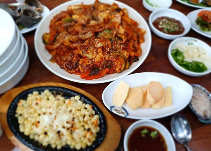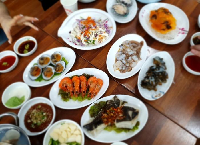 바이크 타고 드라마 촬영지 바닷가 산책도 하고 저녁 식사는 횟집에서. 이 집 음식도 다 맛있었어요.