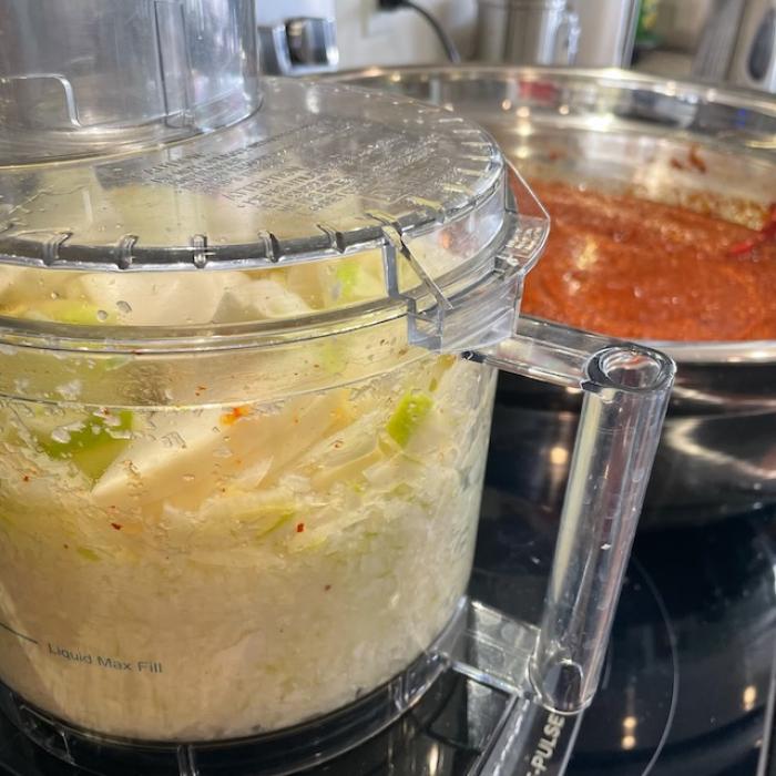 갓과 부추는 잘게 썰어넣고, 마늘, 생강, 새우젓은 푸드프로세서에 갈아서 넣었습니다. 찹쌀풀과 멸치액젓도 넉넉하게 부었어요.