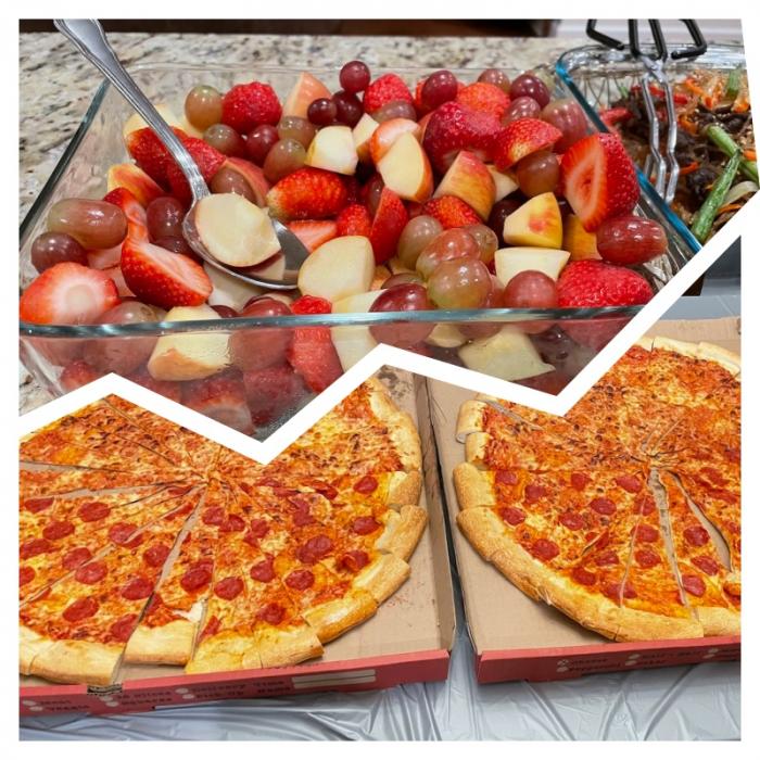 과일을 먹게 좋게 썰어 담고 지름 1미터 핏자는 두 판 주문하고