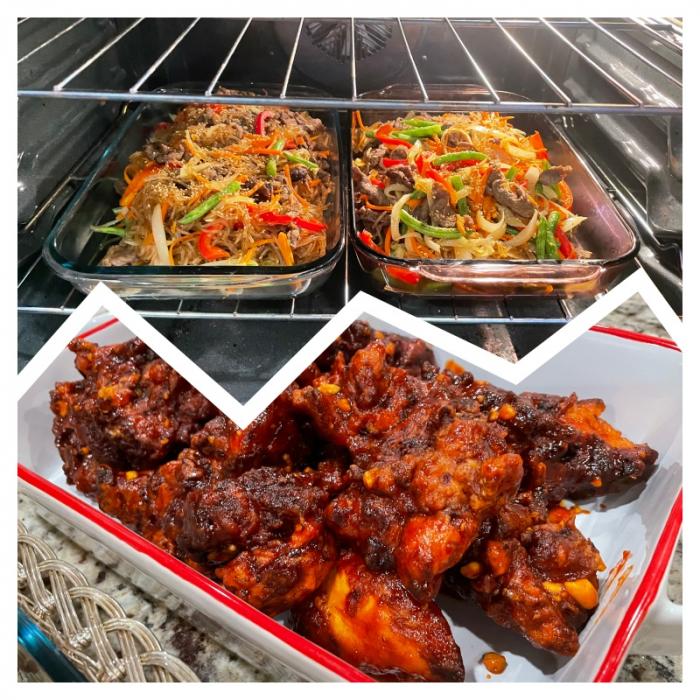 잡채와 양념치킨 (케이 치킨 이라고들 해요 요즘 미국에서는요) 은 대용량으로 만들어서 오븐 안에 따뜻하게 보관하면서 먹을 만큼씩 꺼내 주었어요.