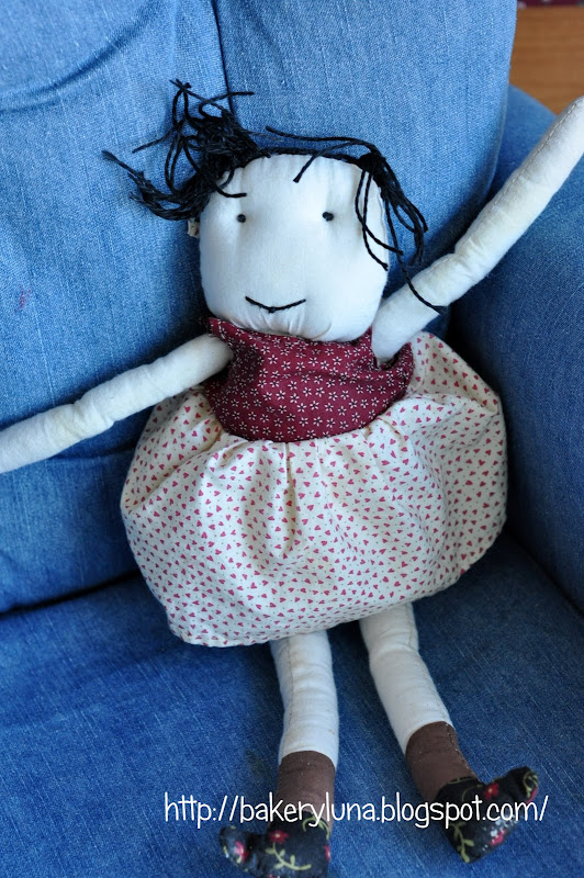 토끼 "비비" 입니다. 이것도 루나가 지은 이름인데..보통 이름들이 베이비 언어네요. 포터리반키즈에 갔다가 비슷한 인형이 있어서 기억해 두었다가 만들었어요. 아기들 옷은 인형 만들기 참 좋은 거 같아요. 순면에 보드랍고. 이것도 루나에 걸쳐 주나한테 입혔던 옷인데 더이상 작아서 못 입고, 얼룩을 지우기 어려워서 이번에 토끼로 환생시켰답니다. 팔다리가 통통해서 느낌이 좋아요
