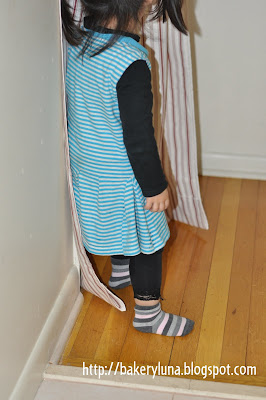 그리고 아래 남는 천과 반팔의 천을 이용해서 치마를 만들어 줍니다. 아무래도 아래 잘라낸 부분만으로는 이쁜 주름을 잡기 많이 모자라서, 양 옆은 팔이였던 천을 이용해서 큰 주름을 넣어 주었어요. 요거이 대박이네요