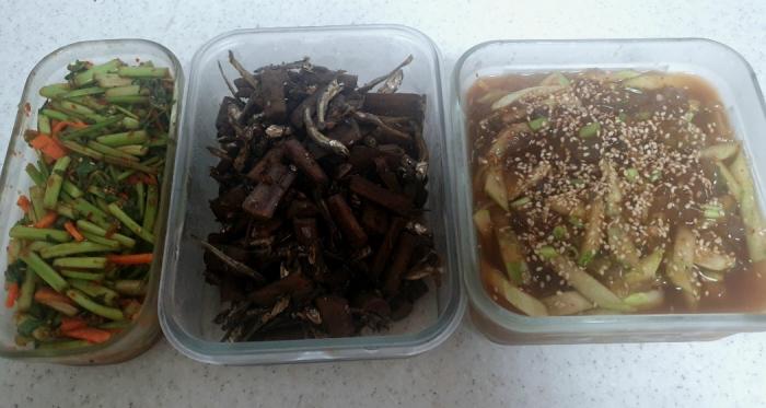 이것도 남편이랑 만든 미나리 무침, 우엉 멸치 조림, 우무 무침.