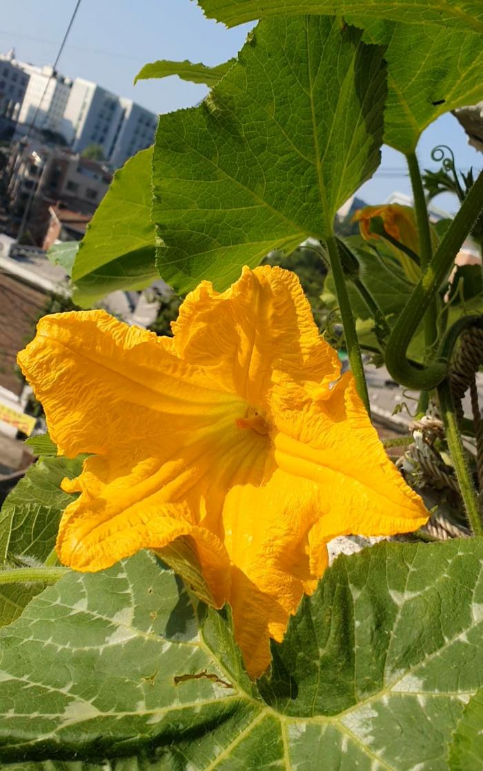 호박꽃이 "안뇽?"명랑하게 웃고 있습니다.
