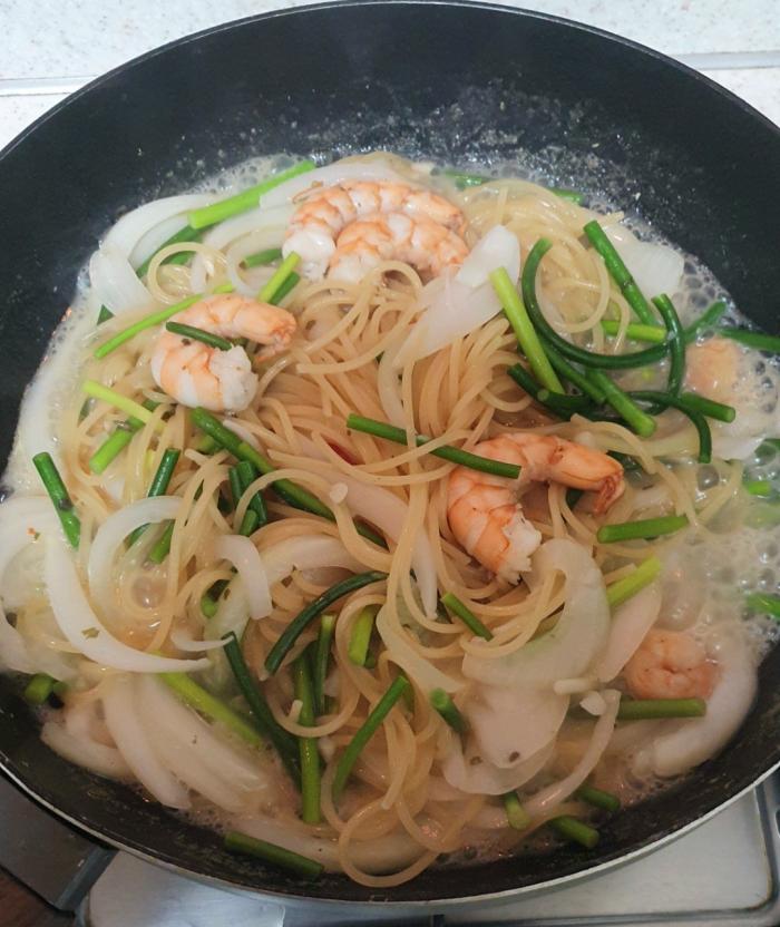 반찬 만들고 마늘쫑이 있어서 점심으로 같이 만들어 먹은 원팬 오일 스파게티.