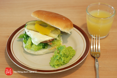 직접만든 소고기패티로 만든 버거, 완두콩스프레드,사과주스