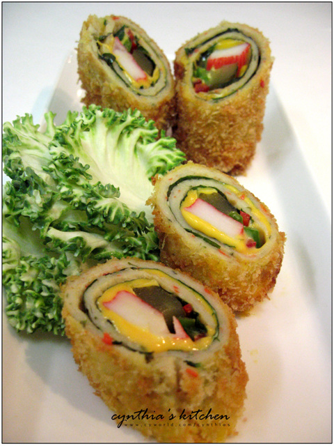 네모난 어묵위에 깻잎과 치즈, 게맛살, 오이피클, 피망 등을 올려 돌돌 말아 튀겨냅니다.