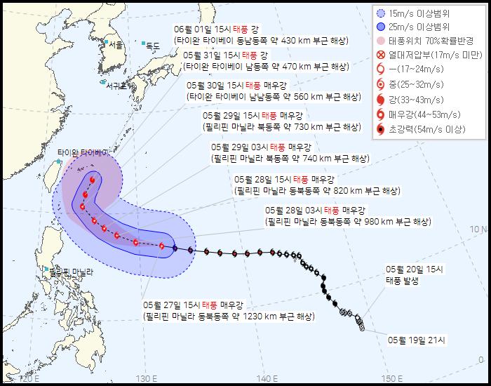 괌 지나서 대만 스쳐 급격히 꺾여 올라오네요.