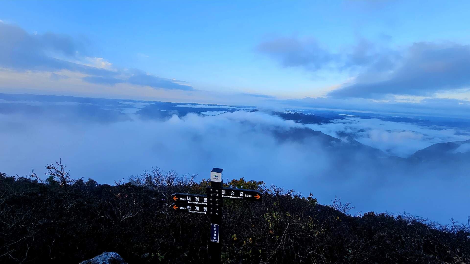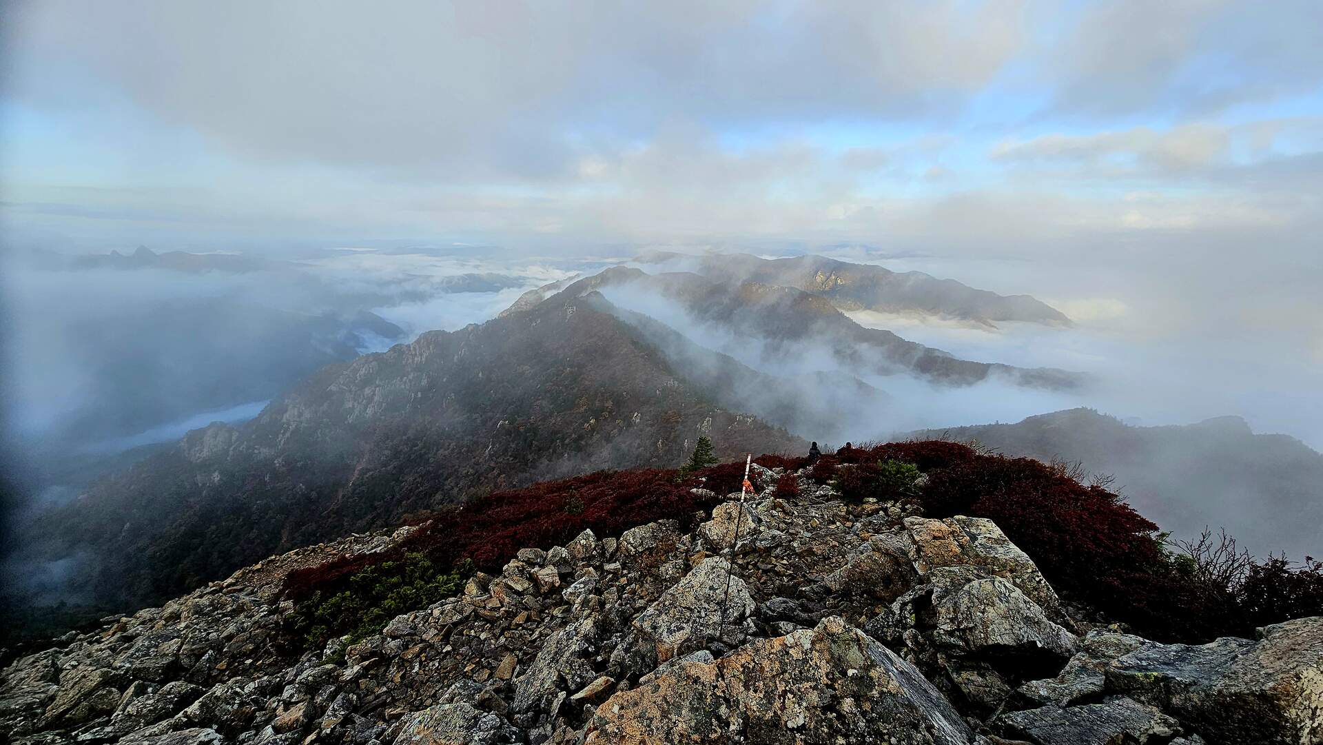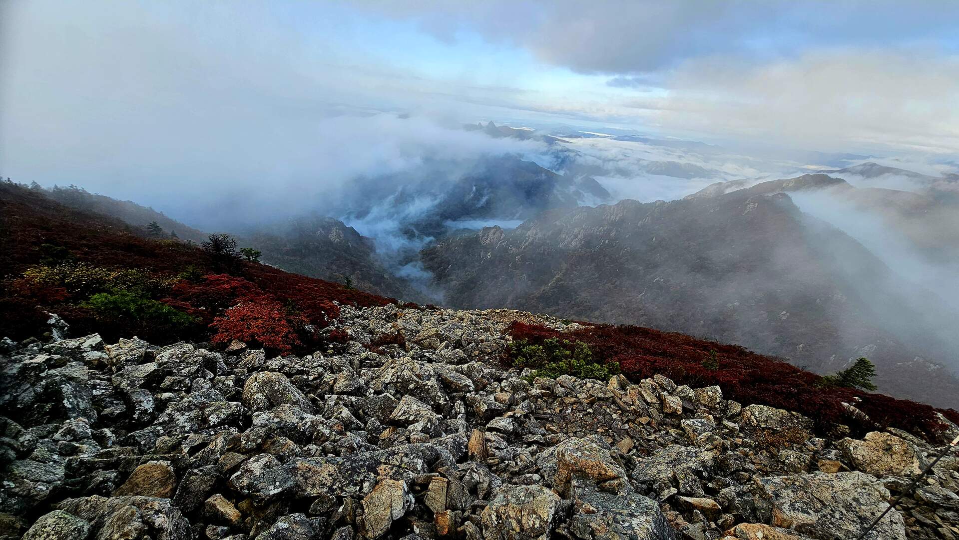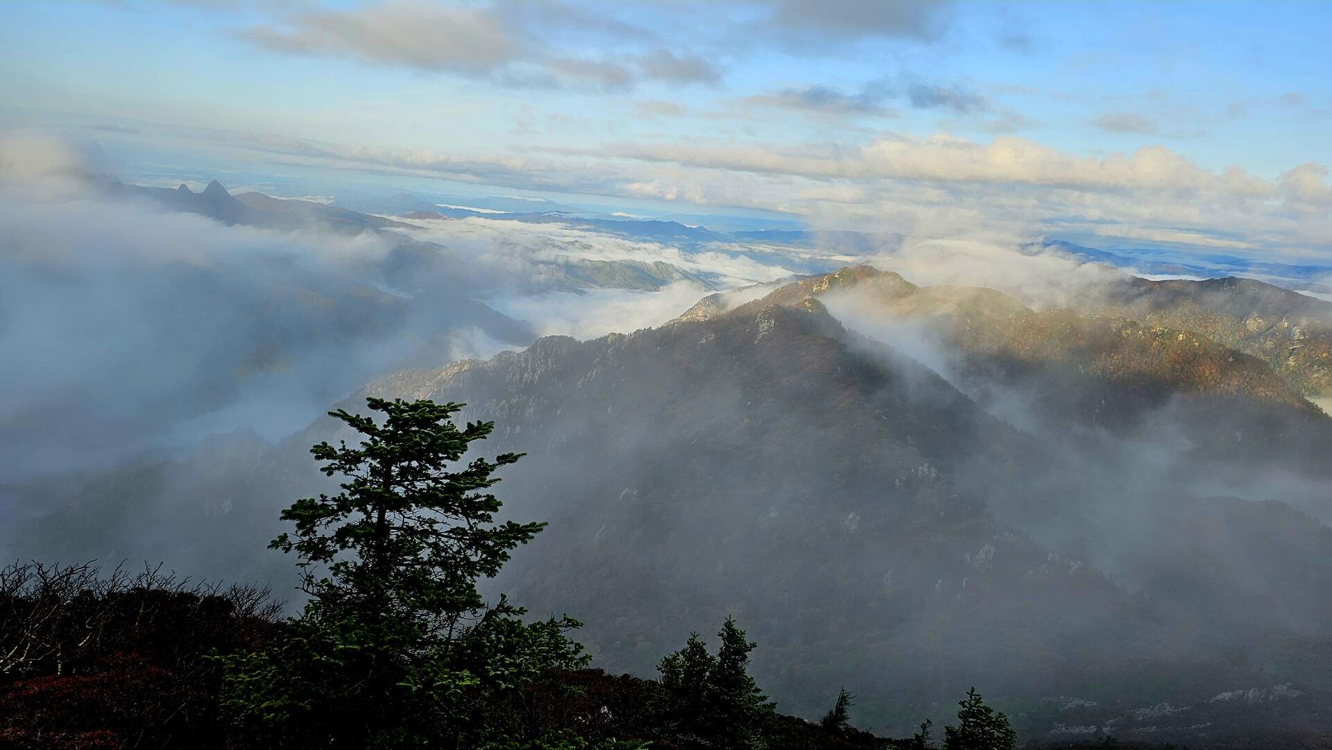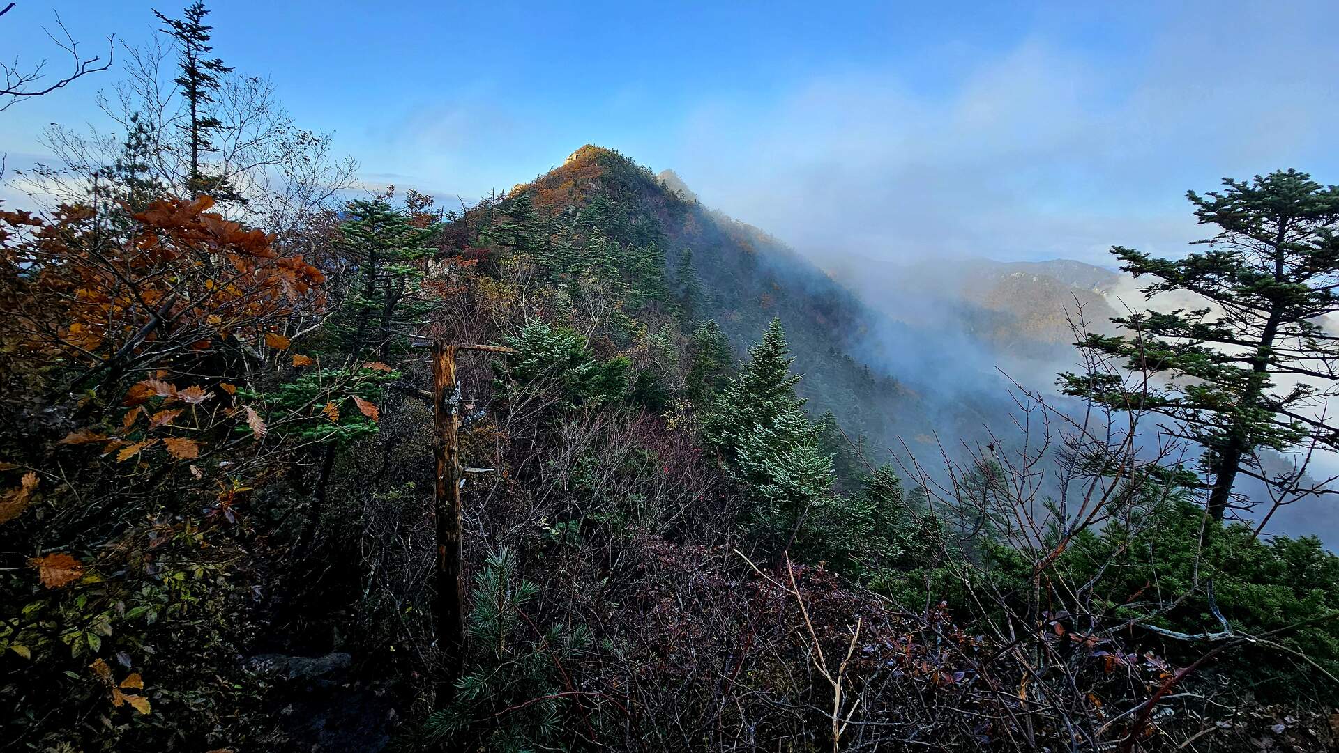 이슬비는 그치고 순간 운무가 걷히더니 대청봉 쪽으로 해가 떠오르고.아주 잠시.