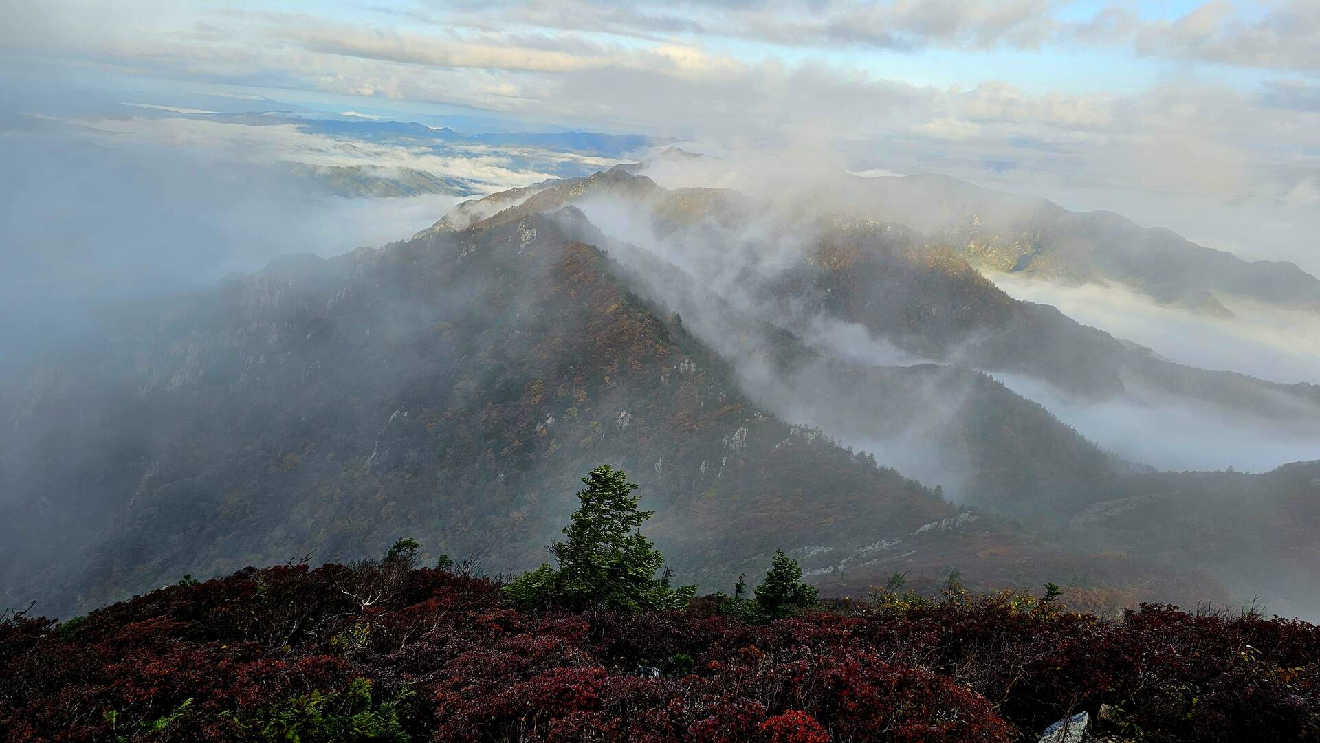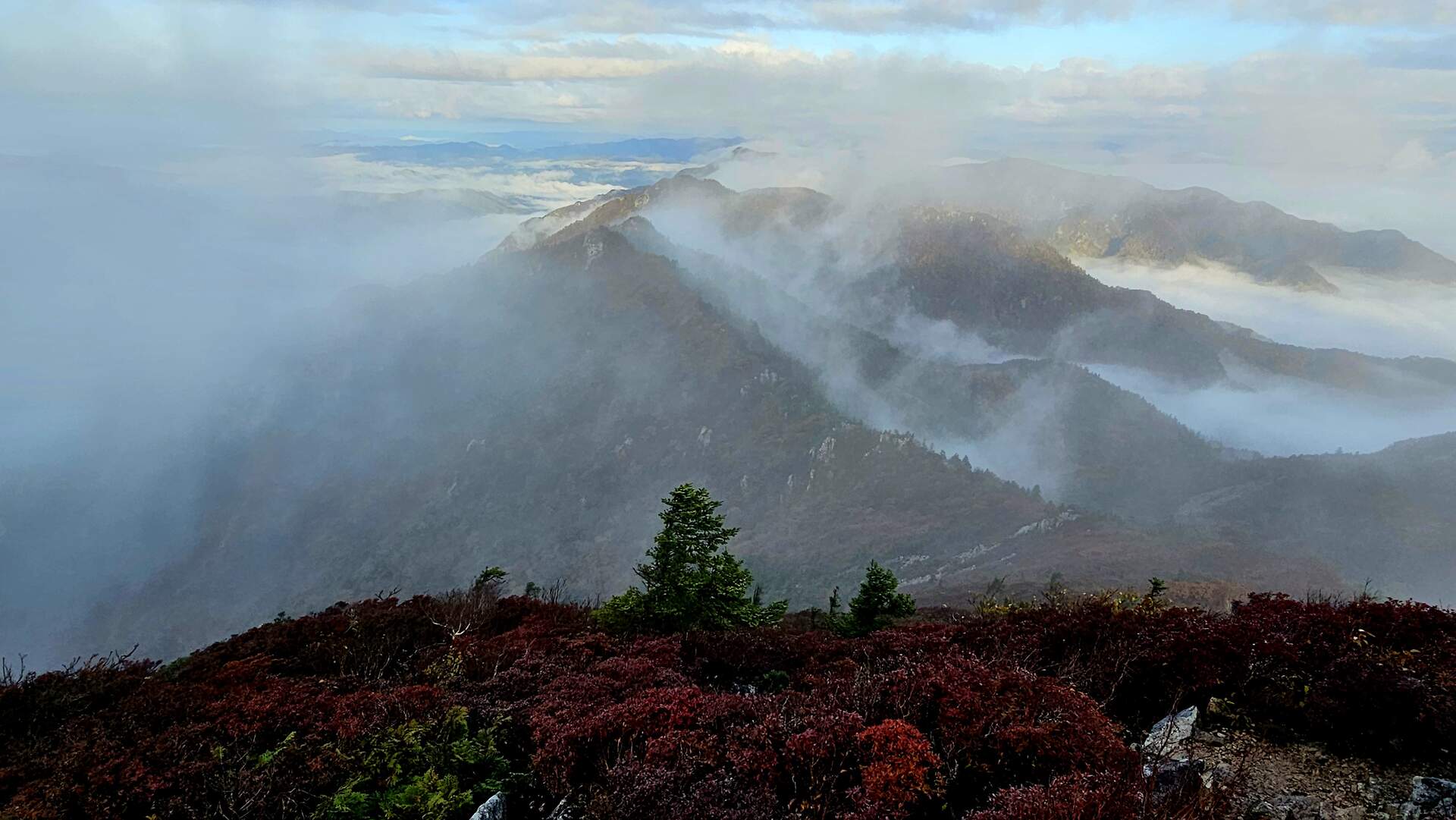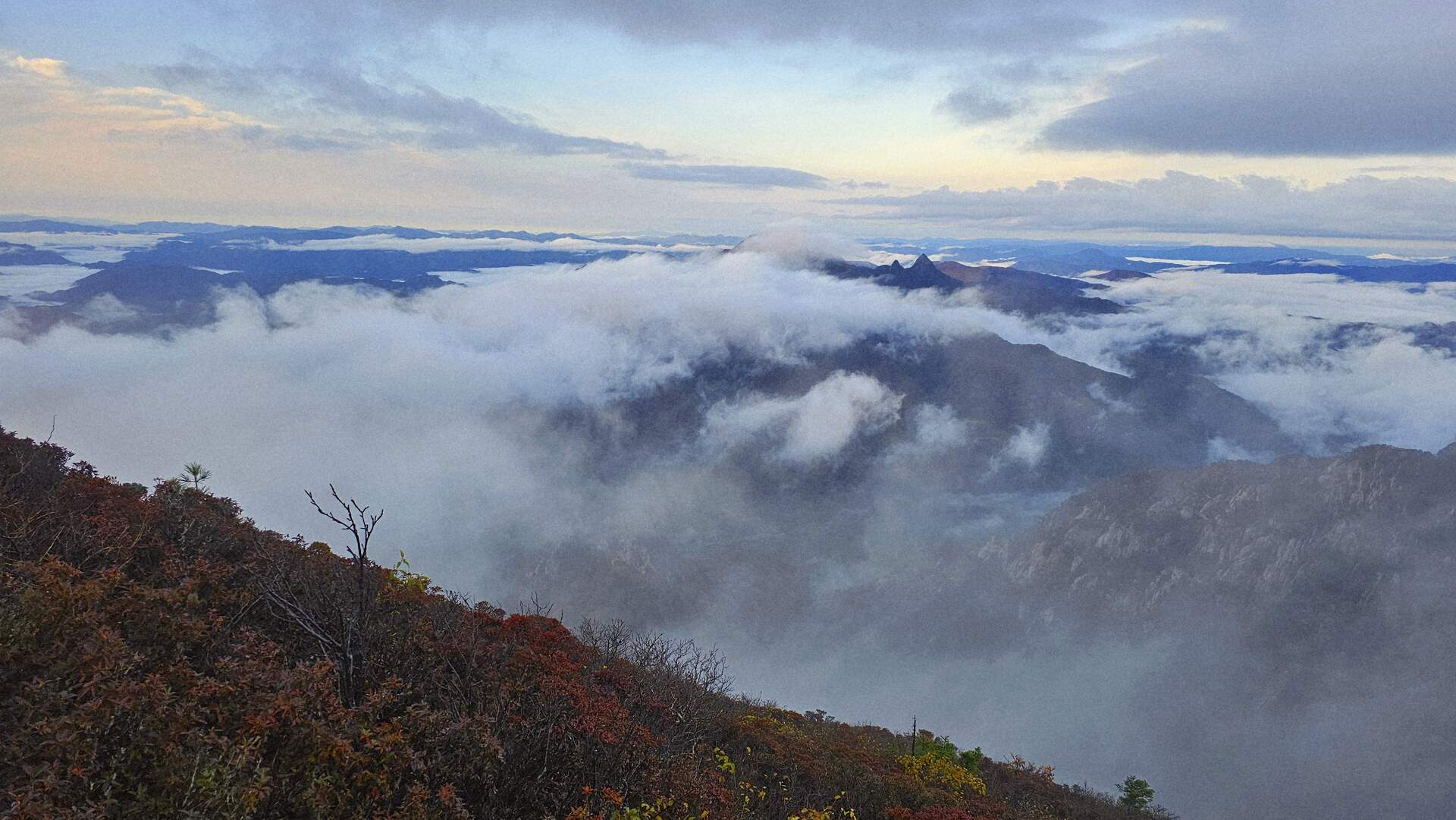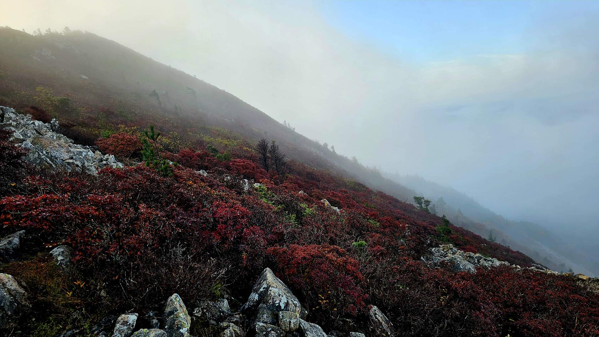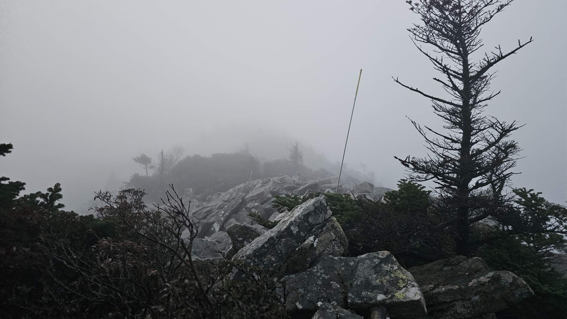 이슬비는 그치고 순간 운무가 걷히더니 대청봉 쪽으로 해가 떠오르고.아주 잠시.